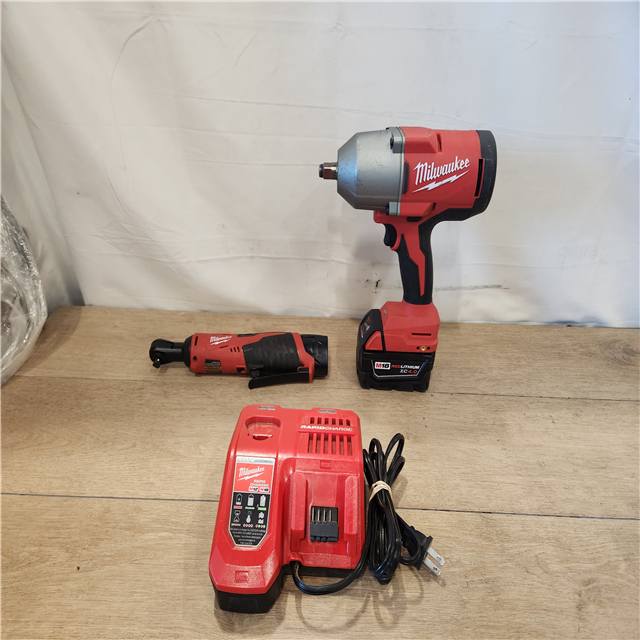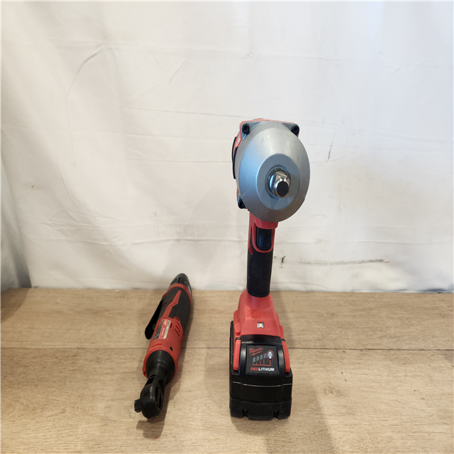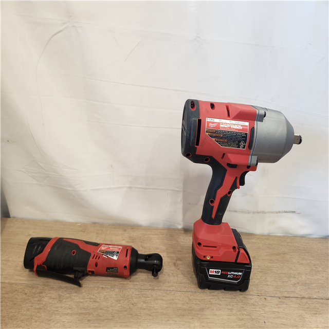 AS-IS- Milwaukee 12/18V Lithium-Ion Cordless 3/8 in. Ratchet and 1/2 in. High Torque Impact Wrench with Friction Ring Combo Kit