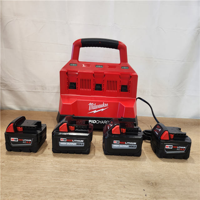 AS-IS- Milwaukee 18-Volt Lithium-Ion Battery Pack (2) 5.0Ah and High Output Battery Pack (2) 6.0Ah with PACKOUT 6-Port Rapid Charger