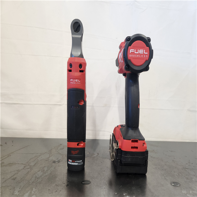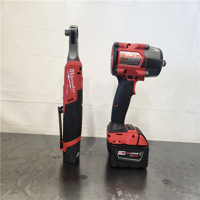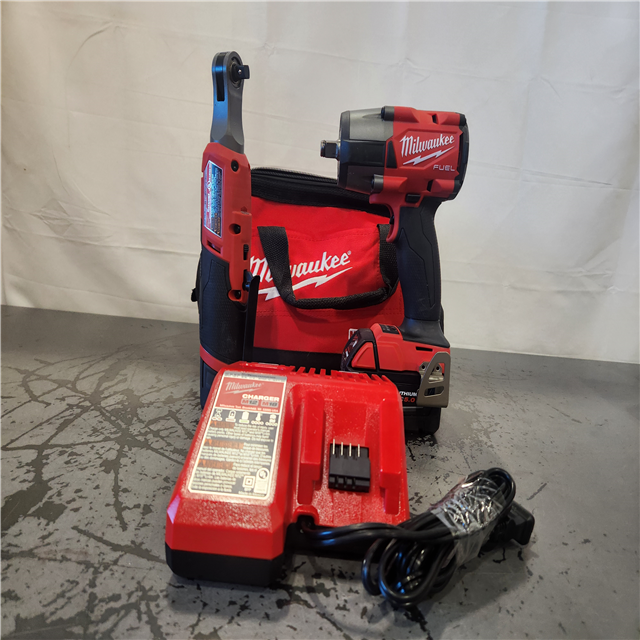 AS-IS- Milwaukee FUEL 18V Cordless Mid Torque 1/2 in. Impact Wrench w/ M12 FUEL 3/8 in. Ratchet & Battery/Charger Combo Kit