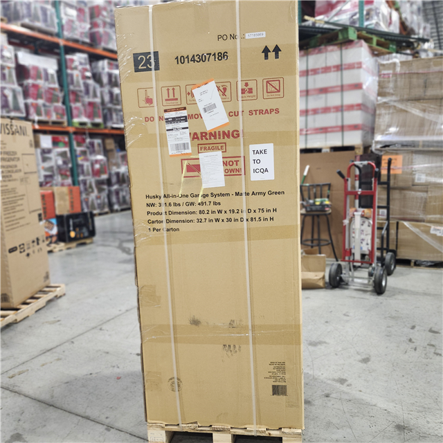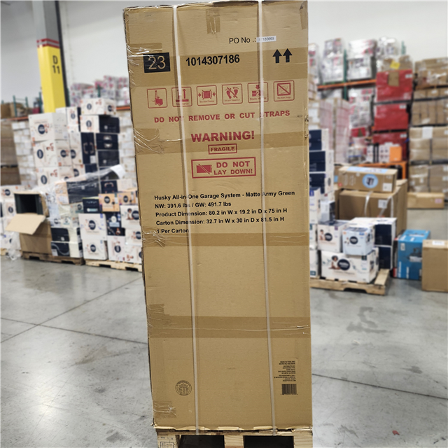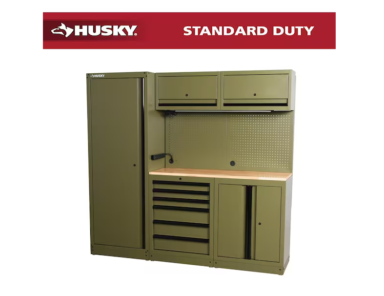 DALLAS LOCATION - AS-IS Husky 80.2 in. W x 75 in. H x 19.2 in. D Steel 8-Piece Garage Storage System in Matte Army Green with Solid Wood Worktop