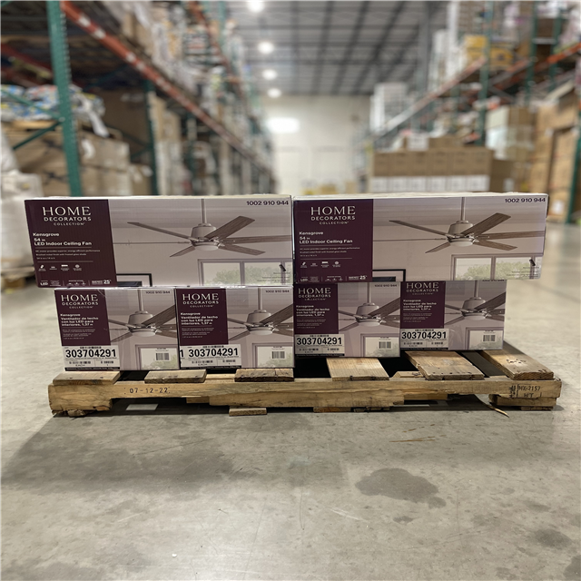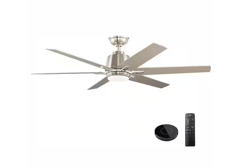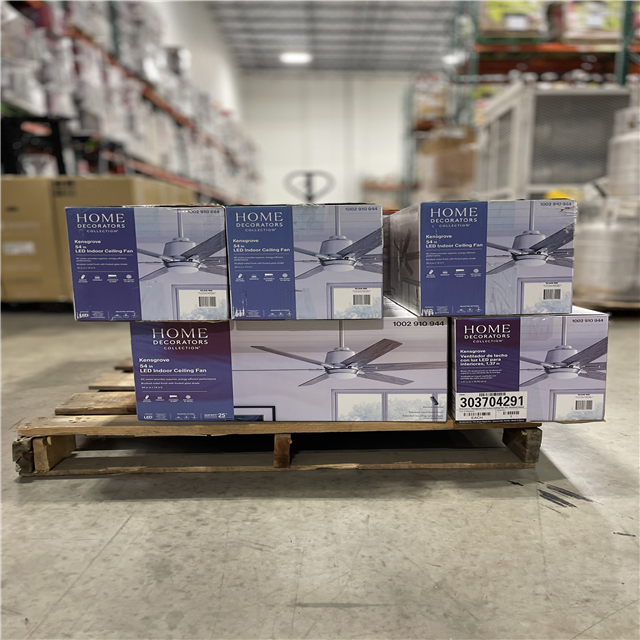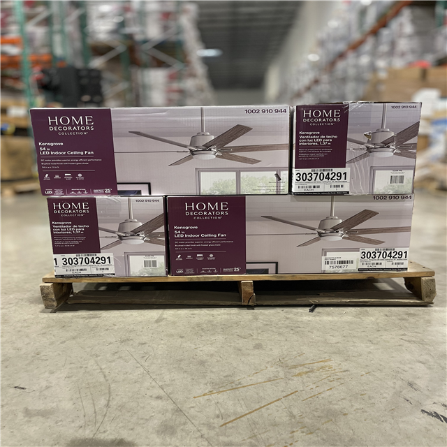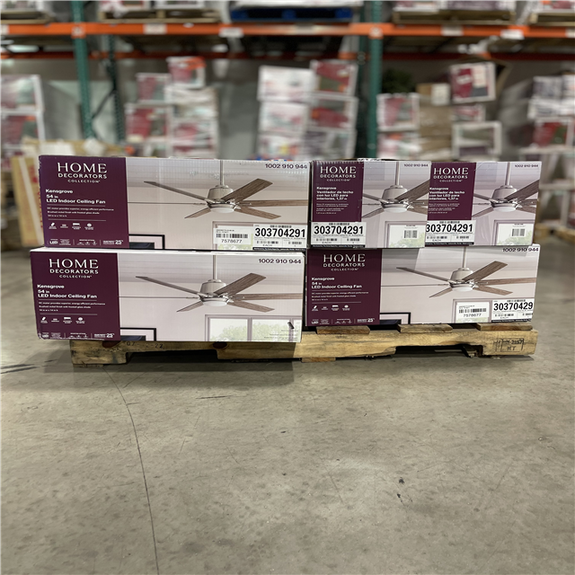 DALLAS LOCATION - Home Decorators Collection Kensgrove 54 in. Integrated LED Indoor Brushed Nickel Ceiling Fan with Light Kit works with Google Assistant and Alexa PALLET- (12 UNITS)