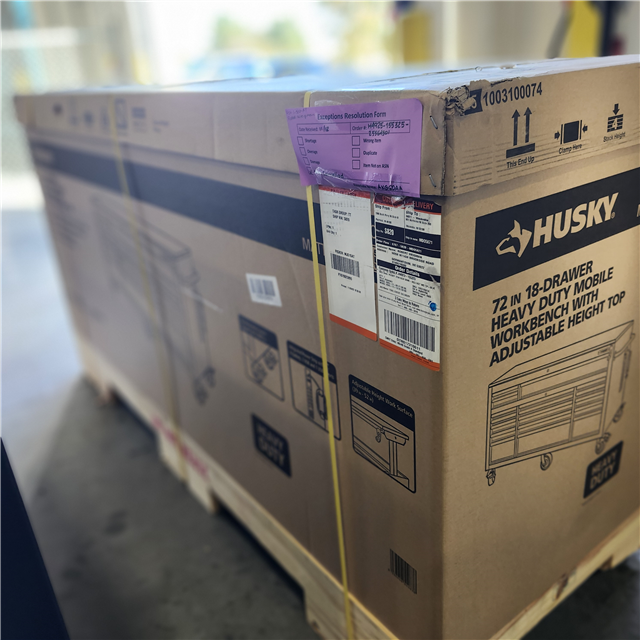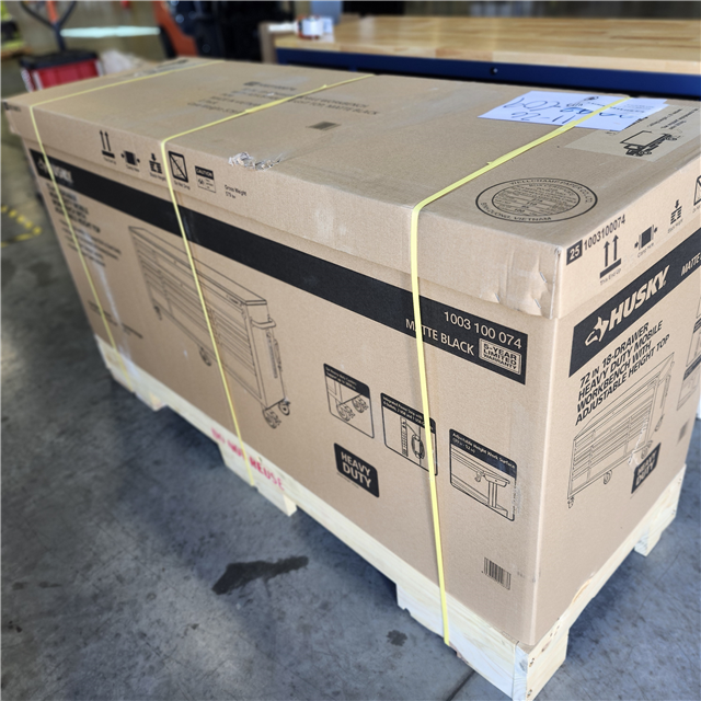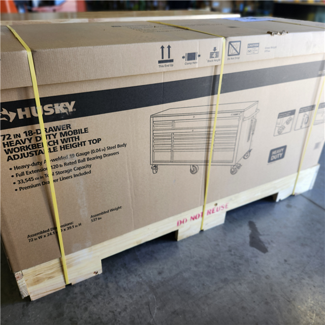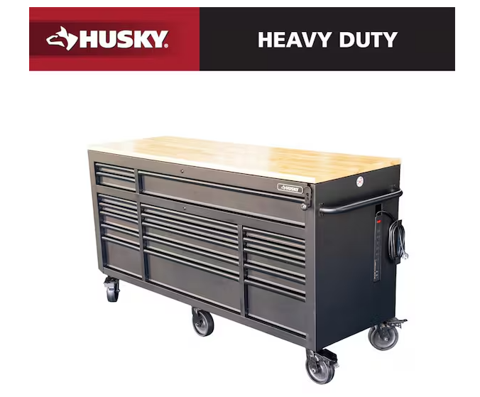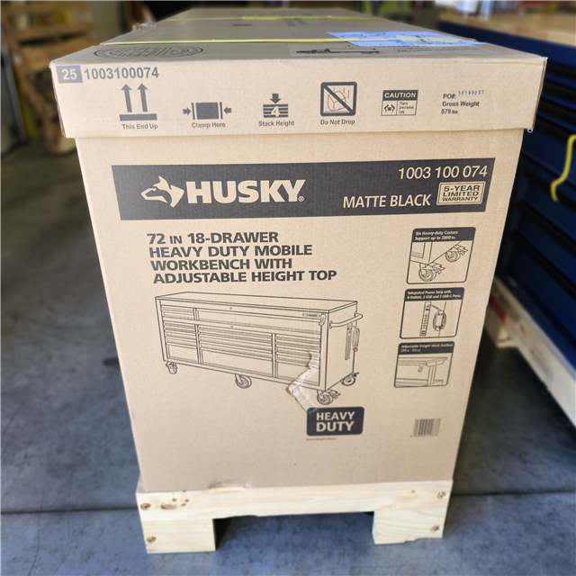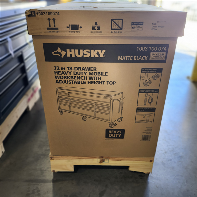 DALLAS LOCATION- Husky 72 in. W x 24 in. D Heavy Duty 18-Drawer Mobile Workbench Cabinet with Adjustable-Height Hardwood Top in Matte Black