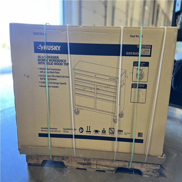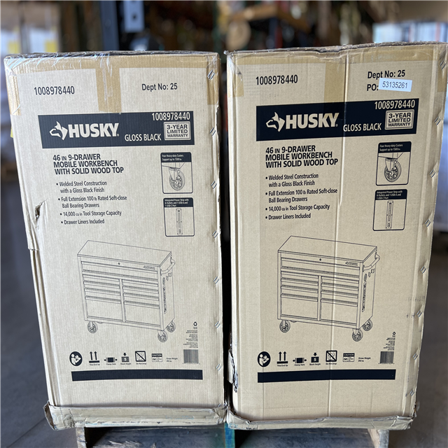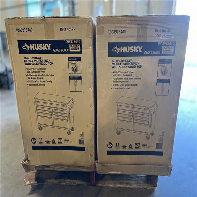 DALLAS LOCATION - Husky Tool Storage 46 in. W x 18 in. D 9-Drawer Mobile Workbench Cabinet in Gloss Black PALLET -(2 UNITS)