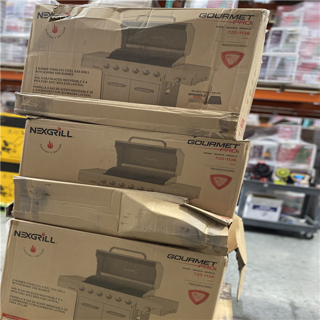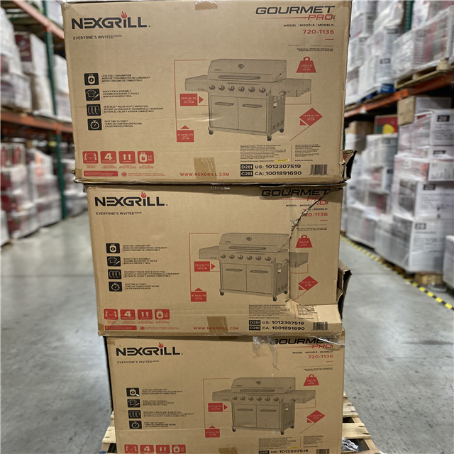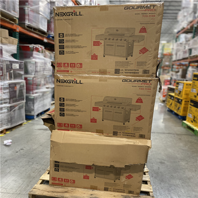 DALLAS LOCATION- NEW!- Nexgrill Gourmet Pro 6-Burner Stainless Steel Propane Gas Grill with Searing Side Burner and Griddle Max Insert PALLET (3 UNITS)