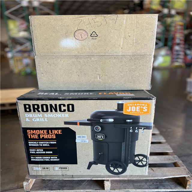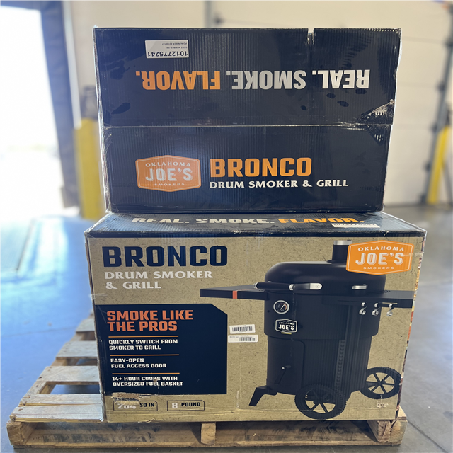 DALLAS LOCATION - OKLAHOMA JOE'S Bronco 18 in. Heavy Duty Charcoal Drum Smoker and Grill with 284 sq. in. Cooking Area in Black PALLET - (3 UNITS)