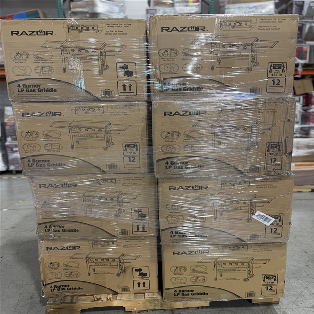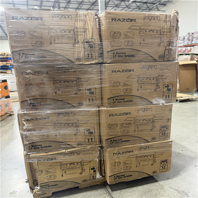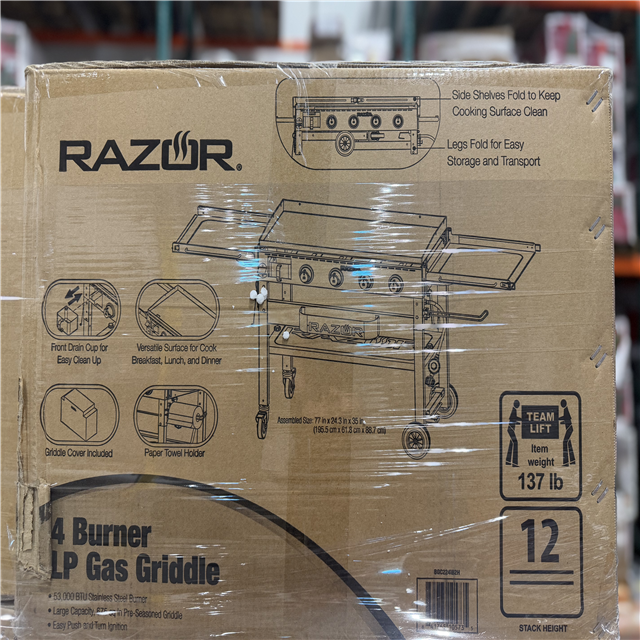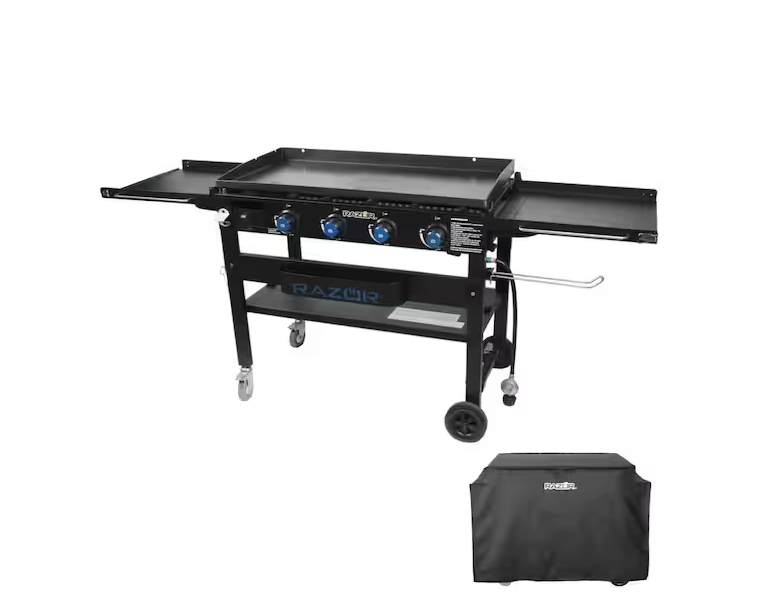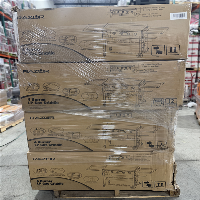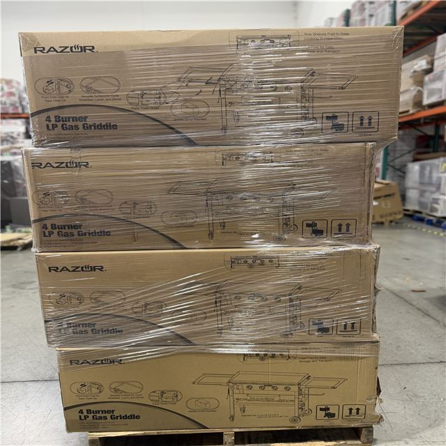 DALLAS LOCATION - Razor 37 in. 4-Burner Portable Propane Gas Griddle Flat Top Grill in Black with Foldable Shelves and Cover PALLET- (8 UNITS)