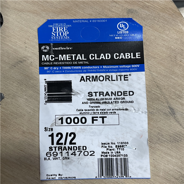 DALLAS LOCATION - Southwire 12/2 x 1 000 ft. Stranded CU MC (Metal Clad) Armorlite Cable