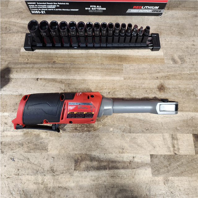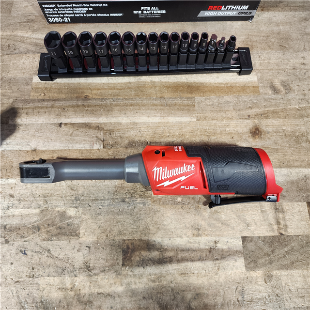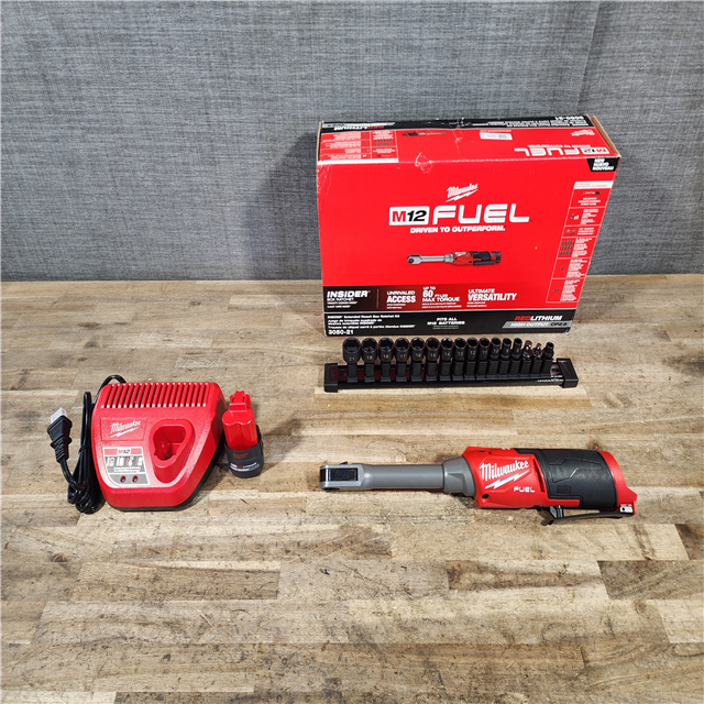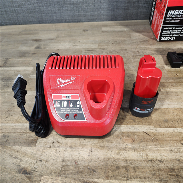 HOUSTON LOCATION - AS-IS MILWAUKEE M12 FUEL INSIDER 12V Lithium-Ion Brushless Cordless 1/4 in. - 3/8 in. Extended Reach Box Ratchet Kit W/ Battery Charger