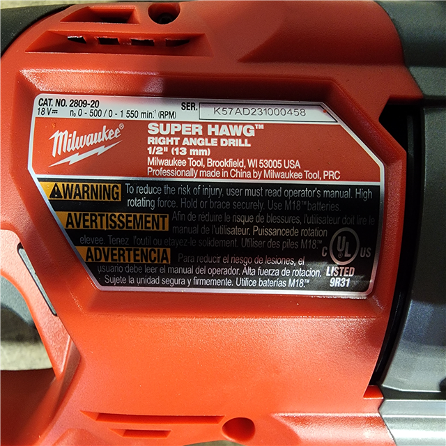 HOUSTON LOCATION - AS-IS Milwaukee M18 18V Fuel 1/2 Right Angle Drill Super Hawg Cordless Lithium-Ion 2809-20 (TOOL ONLY)