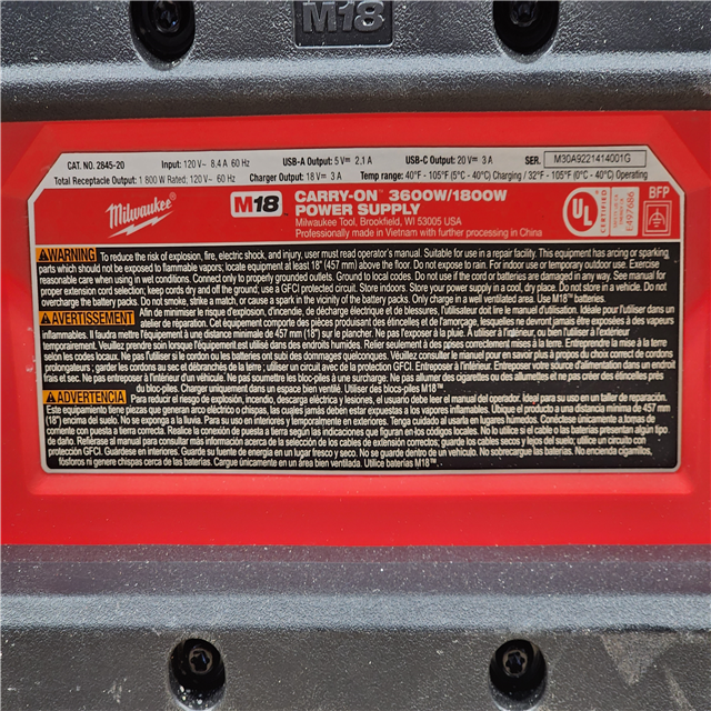 HOUSTON LOCATION - AS-IS Milwaukee M18 Cordless 3600-Watt/1800-Watt Battery Powered Power Supply (Tool Only)