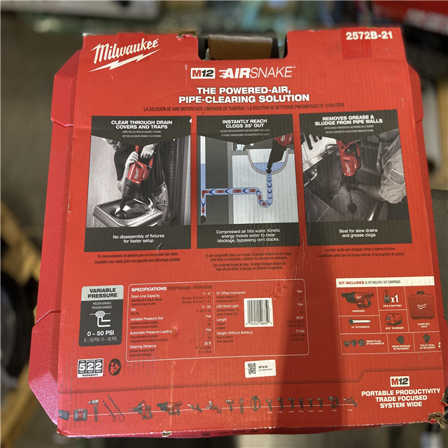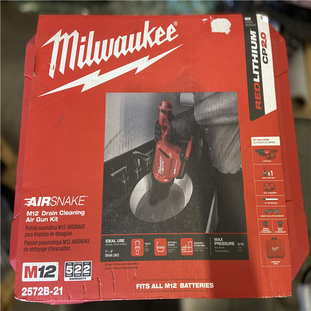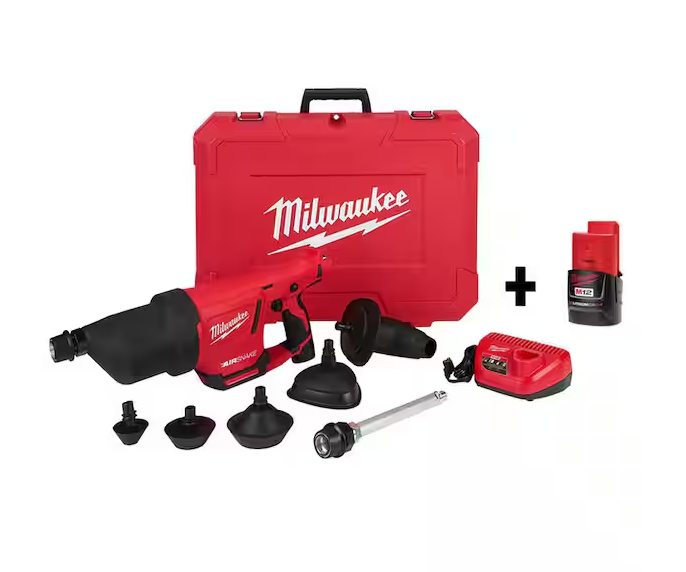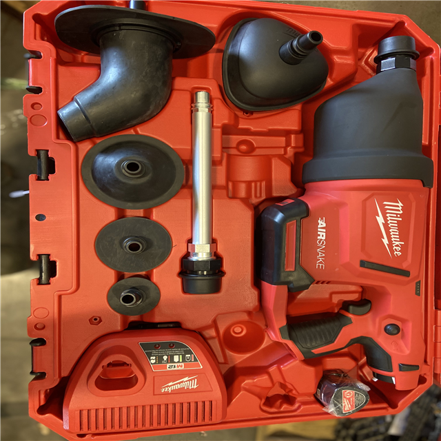 LIKE NEW! - Milwaukee M12 12V Lithium-Ion Cordless Drain Cleaning Airsnake Air Gun Kit with (2) 2.0 Ah Batteries Toilet Attachments