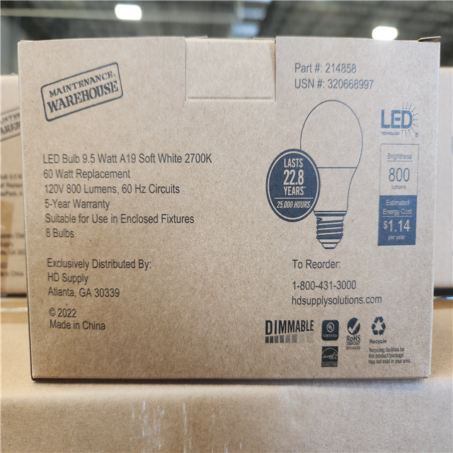 Phoenix NEW LED Bulb 9.5 Watt A19 Soft White 2700K 60 Watt Replacement 8 Bulbs/Pack 4 Total Packs Per Box Pallet (98-Boxes)